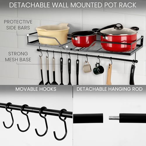 - MAXIMISED STORAGE SPACE: Enjoy a clean, tidy and clutter-free kitchen with this 3-in-1 wall-mounted pot and pan rack. Our set features a sturdy storage shelf, a detachable rail, 10 hanging S-hooks and 2 pot/pan lid holders – perfect for efficiently organising your kitchen.