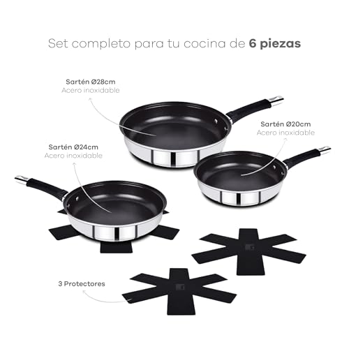BERGNER BASTER 6-Piece Stainless Steel Frying Pan Set 20 + 24 + 28 cm with Hollow Handles – Includes Protectors – Silicone Handles and Non-Stick Coating – Induction Battery
