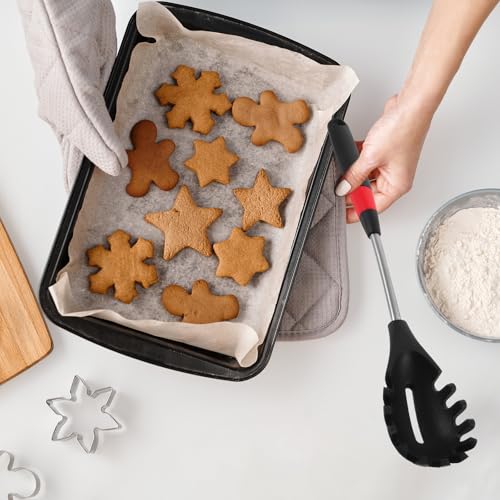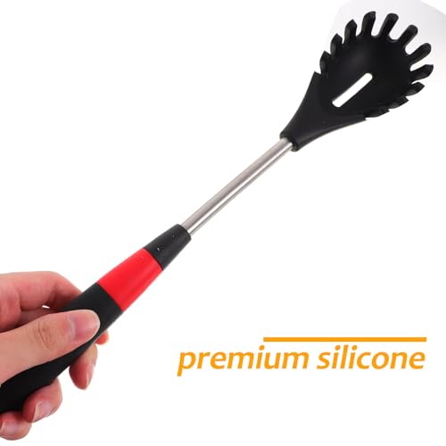 BESPORTBLE Stainless Steel Long Handle Silicone Noodle Spoon with Slotted Colander for Kitchen Utensils, Heat Resistant Spaghetti Strainer and Server Spoon for Home and Restaurant Use