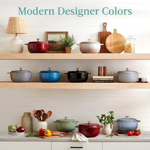 - ELEVATE YOUR KITCHEN: A clean, glossy finish makes this dutch oven both a nostalgic icon and a modern addition to any well-equipped kitchen; features a brushed metal handle (silver or gold) for an extra touch of style!; OVERALL DIMENSIONS: 15"(L) x 12"(W) x 8"(H); OVEN CAPACITY: 7.5 Qt.