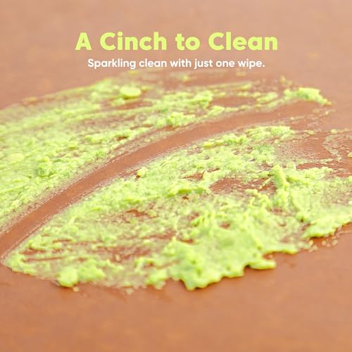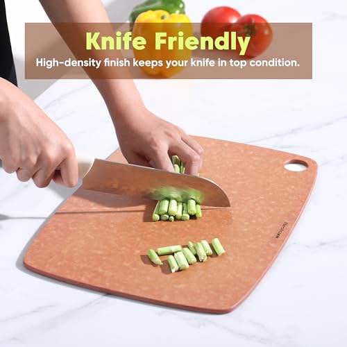 - Knife-Friendly & Heat Resistant – The eco-friendly wood fibre surface is gentle on your knives, reducing deep cut marks and helping maintain their sharpness. With heat resistance up to 183°C (350°F), this board can also be used as a trivet, offering versatile use without leaving marks.