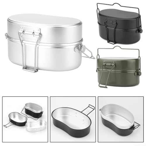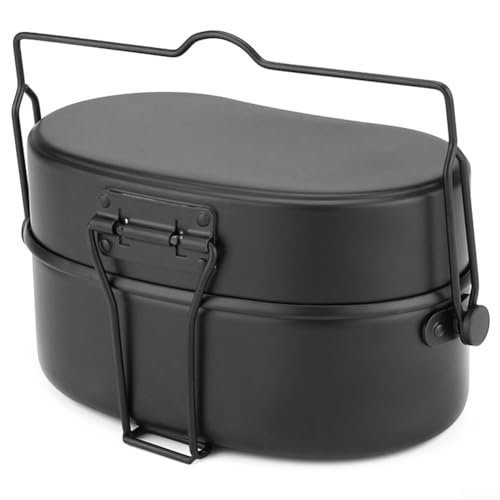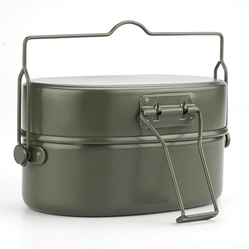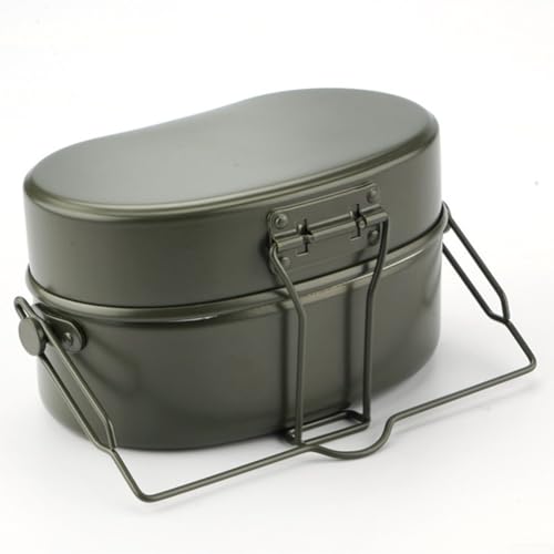 - German army lunch box, perfect for alone camping. It contains a frying pan, a steamer, a hanging pot – a complete outdoor cookware set. Roast, boil, steam and sear for an opulent camping meal. The cookware is portable, can be carried or hung up and offers a variety of uses as well as easy transport.