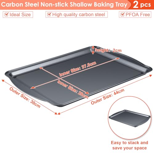 - 【Practical Baking Set】This set contains two shallow baking trays for oven-non stick. The baking tray measures 17.32×11.81×0.79 inches(44cm*30*2cm), which provides the ideal size and capacity for for baking and cooking. it is a convenient addition to any baker's kitchen. In addition, when not in use, they can be stacked tightly and seamlessly, which can save you a lot of kitchen space.
