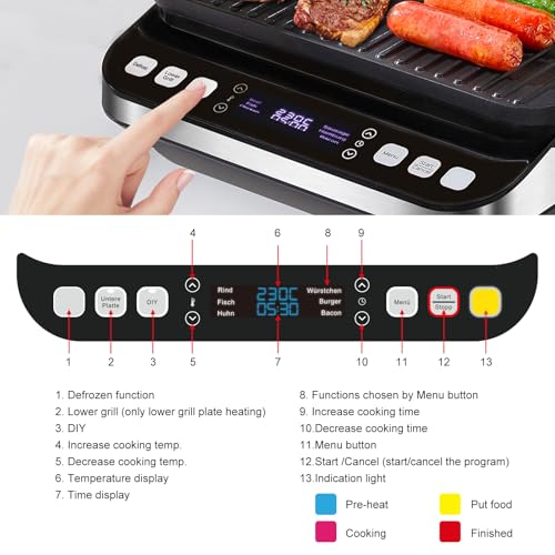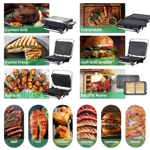 • Customizable cooking options: Contact grill, panini press maker, full griddle, full grill, half grill, half griddle, top melt.Menu mode with 4 settings: Defrost, Reheat, Barbecue, and Sear.
