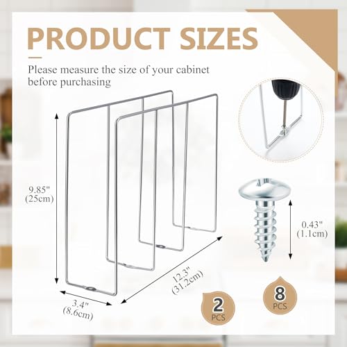 This package contains 2 pcs cookie sheet organizer, and 8 pcs screws, Its layout is designed to save you time and energy, and is suitable for both framed and frameless cabinets; Before purchasing, measure your cabinet size