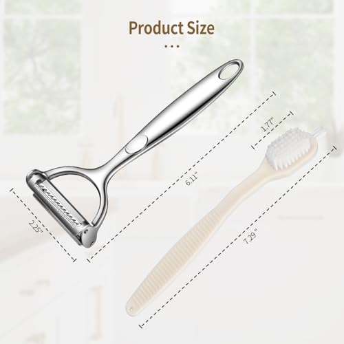 The 2 in 1 multifunctional Y vegetable peeler. Upgrade precision blades, Stronger and sharper, smooth, effortless peeling. Package Included: 2pcs julienne peelers and 2pcs clean brushes