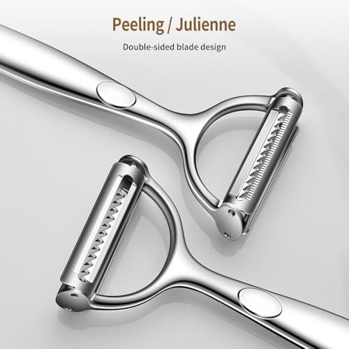 - 2 in 1 Julienne Peeler for Kitchen: Standard Blade: suitable for peeling and chipping. Julienne Blade: Julienne carrots to make simple veggie salads.Works flawlessly on Fruit, Veggie, Potatoes, Carrot, Cucumber and etc. Easy Julienne and precise peeling