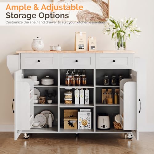 Bonnlo 120x75x89cm Kitchen Island on Wheels with Breakfast Bar, Large White Kitchen Island with Storage, 2 Doors & 3 Drawers