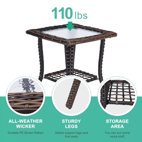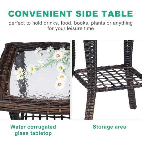 Bonnlo Small Rattan Side Table with Tempered Glass Top, Garden Coffee Tables for Outside, Weatherproof for Patio Porch Backyard Brown