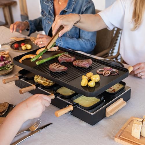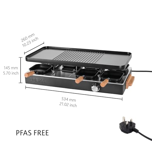 BOSKA Raclette Gourmet Party – Tabletop Grill Set for 8 People – PFAS-Free – Ceramic Grill Plate – Beechwood Handles – Reversible Aluminum Griddle – Black