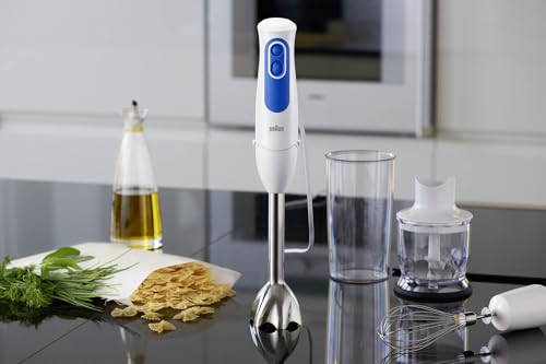 Braun MultiQuick 3 MQ3025 Hand Blender, Spaghetti Mixer, 2 Speeds, Splash Control, Dishwasher Safe parts, 350ml Chopper, Whisk and BPA-Free Plastic Beaker – White