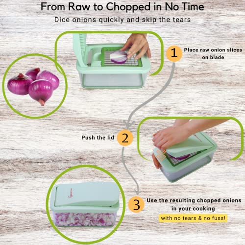 - DOUBLE CONTAINER CAPACITY, DOUBLE THE CONVENIENCE: Don't let a small container slow your chopping down. We increased the size of our container by 200% compared to other choppers on the market, allowing you to chop 200% more, all in one go. Use it as an onion dicer (without tears), or as a general food dicer to prep a wide variety of veggies & fruits e.g. mushroom, tomato, cucumber, zucchini, bell pepper, radish, potato, kiwi, apple, melon, banana, pear, strawberry etc. in half the usual time.