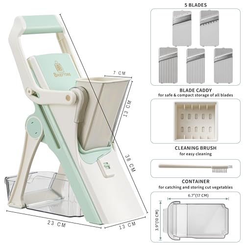 Brieftons Safe Mandoline Vegetable Slicer with 5 Removable Blades to Slice, Julienne, Chip, Chop, Dice Veggies/Fruits, Injury-Free Design, with Catch Container, Cleaning Brush, 5 Recipe Ebooks