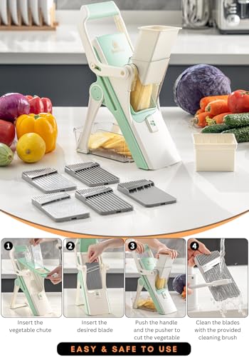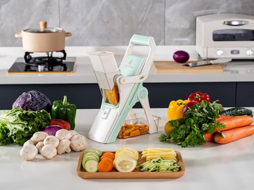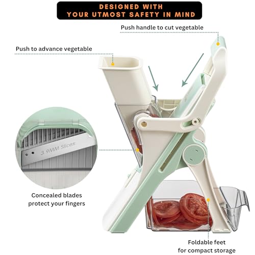 • 🧩 COMPACT, SAFE, EASY-TO-USE MANDOLINE SLICER: Tired of spending too much time prepping veggies? Do you own a vegetable slicer that is ineffective or hazardous to use due to sharp, exposed blades? Our mandolin slicer might just be the answer for you. It sets a new benchmark in safety and versatility for kitchen mandolines, with totally concealed blades and 5 cutting modes. This is no ordinary mandoline slicer & can help improve your productivity many times.