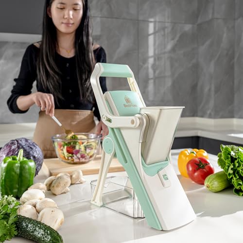 • 🥕 EFFORTLESS SLICING & DICING: Transform your cooking today! The Brieftons Safe Mandoline Slicer features 5 interchangeable blades to slice, dice, chop, and julienne vegetables and fruits with precision and ease. It can deliver consistent, uniform cuts in minutes and boost your culinary creativity to create professional-looking garnishes, crispy fries, elegant salads, vegetable pizza toppings, stir fies, soups, crudities, stews, desserts. Just a simple push of the handle and you are done!