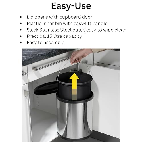 - Inside cupboard mounted waste bin with lid can be fitted to the left or right of most cupboards, with easy DIY installation
