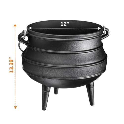 Bruntmor 12 Quart Cast Iron Dutch Oven Cauldron Pot – Camping Cookware with Lid – Pre-Seasoned Heavy-Duty Potjie for Stews, Soups, Braising, and Frying Over Fire Pit Grill or Camp Stove – Black