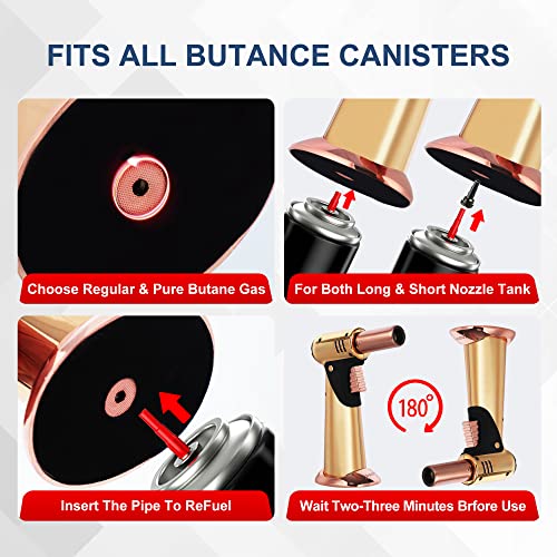 • FITS ALL BUTANE TANKS: Concerned about which tank type to choose? This kitchen blow torch is compatible with any brand of butane gas, whether with long or short nozzles! It can be directly refilled from long nozzle gas tanks. For short nozzle tanks, use the included red adapter to extend the nozzle, then refill the torch.