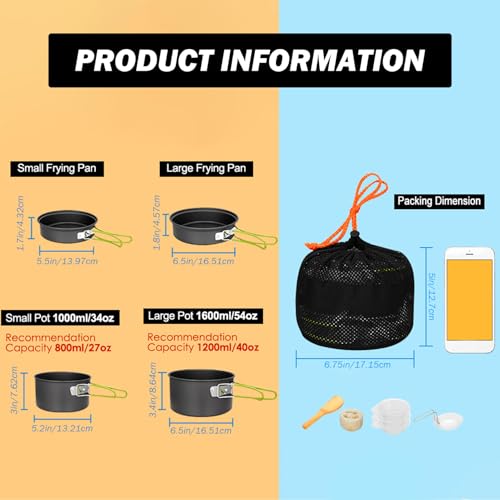 - Package listing: Camping Cooking Set includes 1 large pot, 1 small pot,1 large frying pan, 1 small frying pan, 1 wooden spoon, 1 plastic spoon, 3 plastic bowls, 1 cleaning sponge and 1 drawstring bag., providing a convenient and organized way to store your cookware. The mesh bag allows for ventilation, preventing any moisture buildup and ensuring cleanliness.