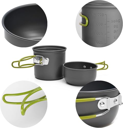 • 9 IN 1 COOKWARE SET – The camping cookware mess kit includes 1 Pot and Pan, 1 500ml 304 cup, 1 set cutlery(4pcs),1 mini stove, 1 storage bag.