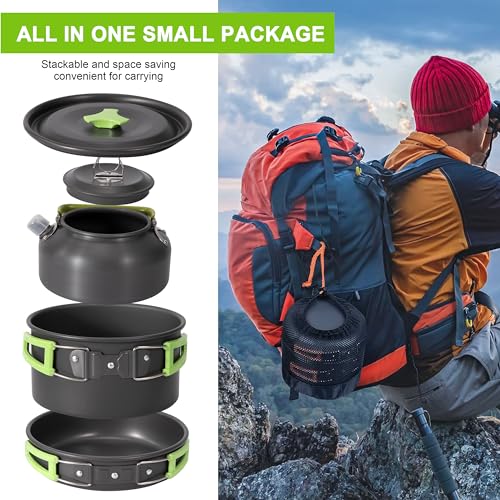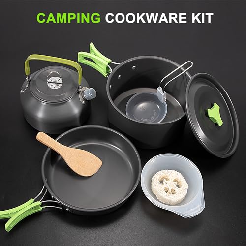 - Portable Camping Cookware Set: A compact camping cookware set is the ultimate solution for outdoor cooking. It includes a kettle, a pot with lid, a frying pan, 3 bowls, a spoon, a spatula, a cleaning sponge and a nylon storage bag. Specially designed for camping and picnic for 2-3 people.