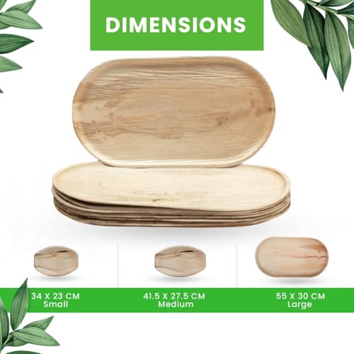 - Spacious & Sturdy Design: Measuring 55 x 30 cm, these palm leaf disposable serving platters offer ample space for serving appetizers, main courses, and desserts. Their durable construction ensures they can handle dry and wet foods without bending, leaking, or breaking
