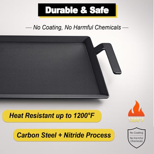 - 【Heavy-Duty Carbon Steel – Lightweight but Durable】:Built from premium carbon steel, this griddle offers high heat retention and quick heat-up like cast iron—without the extra bulk. Nitrided for added durability and rust resistance, it withstands up to 1200°F on open flames, gas burners, or charcoal grills.