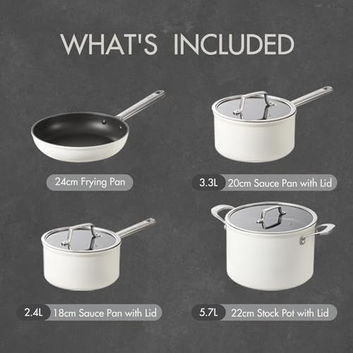 The pots and pans set includes 1 x frying pan (24cm), 2 x saucepan with lid (18cm/2.4L, 20cm/3.3L), 1x stockpot with lid (22cm/5.7L), This pans set includes everything you need to outfit a kitchen for day-to-day cooking.