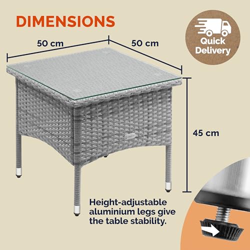 CASARIA® Square Poly Rattan Garden Coffee Side Table | Weatherproof With Glass Top | 50x50x45cm | Height Adjustable Feet | Indoor Outdoor Patio Terrace Balcony Conservatory Furniture | Grey