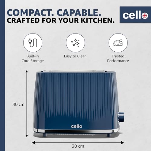 Cello TR191-BL Blue 2 Slice Toaster with Textured Design, Wide Slots, 850W Power, 7 Browning Levels, Cancel Reheat Defrost, High Lift, Crumb Tray, Cord Storage, Illuminated Controls