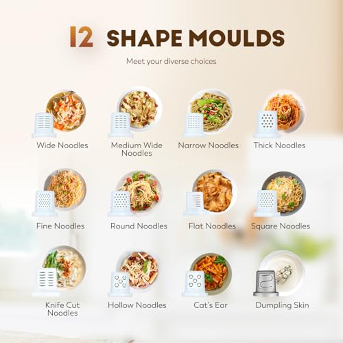 - DIVERSE OPTIONS – This household pasta maker comes with 12 dough shape molds and 2 measuring cups. You can choose to make various types of noodles according to your taste preferences, such as wide and thin noodles, spaghetti, dumpling skins, macaroni, and knife-cut noodles.