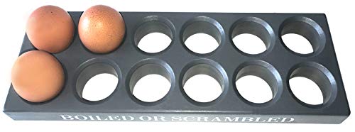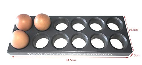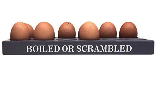 - Wonderful egg rack in charcoal grey. Holds 12 eggs. Printed 'Boiled or Scrambled' on the front and plain on the back (for those who prefer things to be a little more simple)! 31.5cm x 10.7cm x 3cm MDF
