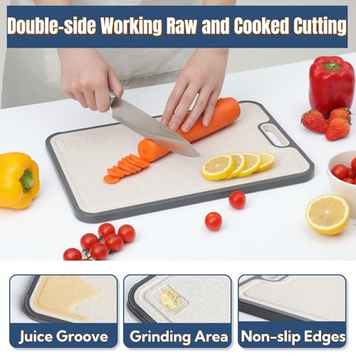 - Practical Design–Specially designed built-in juice groove and garlic grinding area of wheat straw PP cutting board, convenient for grinding seasonings such as garlic and ginger, and silicone border of cutting board is designed to be more non-slip, which ensuring that the cutting board doesn't slip or move.