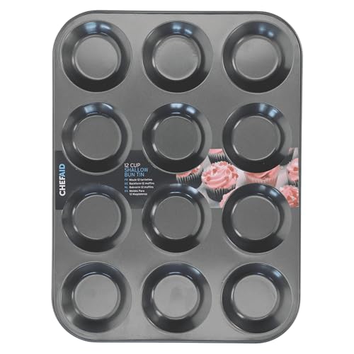 Chef Aid 12 Cup Shallow Bun Tin, Made from Durable and Robust Carbon Steel, Non-Stick Goldflon Coating, 31.5 x 24 cm