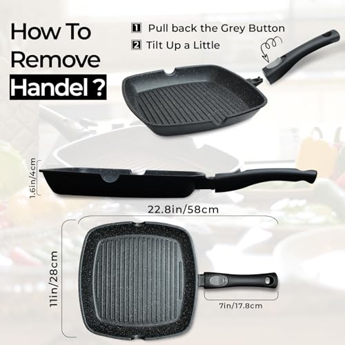 - ✅ Induction Griddle Pan with Removable Handle – Featuring soft grip cool touch Snap-On Bakelite handle that holds on tightly for comfort and safety. It is strong to support the pan and by pulling the grey button the handle comes off and the pan becomes oven friendly