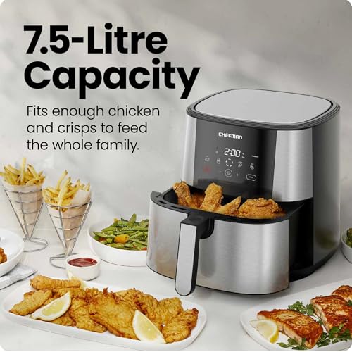 Chefman TurboFry® Touch Air Fryer, XL 7.5 Litre Family Size, 1800W Power, 4 Presets, Uses No Oil, Nonstick Dishwasher-Safe Parts, Automatic Shutoff, Stainless Steel, Uk