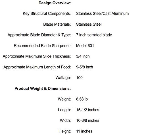 • 7-inch multipurpose stainless steel blade slices from deli-thin to approximately 3/4-inch slices