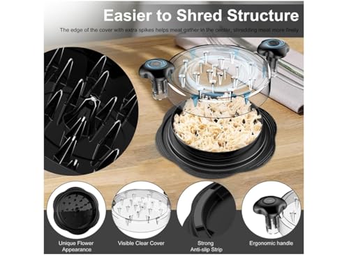 • 【Easy to Use and Ergonomic Handle】This food shredder uses an ergonomically designed handle with a comfortable grip, just put the meat into the shredder, cover the transparent lid, hold the handle with both hands, press down firmly and rotate it from side to side to turn the meat into shredded meat easily, which ensures a comfortable and easy operation, even during heavy use