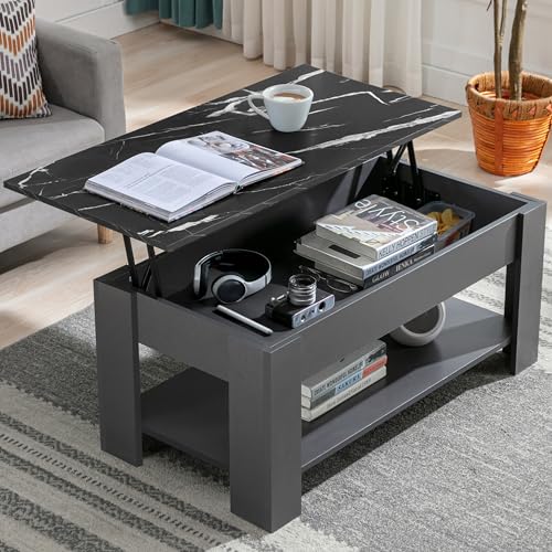 Lift Up Coffee Tables for Living Room, Coffee Table With Storage, Wooden Coffee Table With 1 Shelf Large Hidden Storage Modern Rectangular Sofa End Lift-Top Tea Table Furniture (Marble Black/Grey)