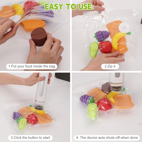 - Powerful & Efficient: Differ from other traditional models, this handheld food vacuum sealer is efficient and easy to use. One-touch operation of the hand held vacuum sealer seals dry foods in 10 seconds. Ideal for meats, vegetables, fruits, seafood, nuts, fish, dry goods, pizza and cooked food, the upgraded bags create airtight seals, effectively slowing spoilage. Vacuum seal anything according your needs.
