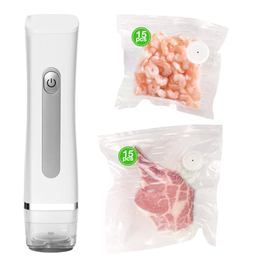 Compact Vacuum Sealer Machine, Protable Vacuum Food Sealer with 30 Reusable Vacuum Bags (Small Size*15, Medium Size*15), Handheld Vacuum Sealer Auto-Stop for Preserving Food, Vegetables, Fruits, Meat