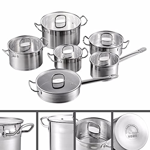 Cooking Pot, Cookware Set 12 Piece Stainless Steel Kitchen Cooking Pot&Pan Sets Induction Saucepan Casserole with Tempered Glass Lid