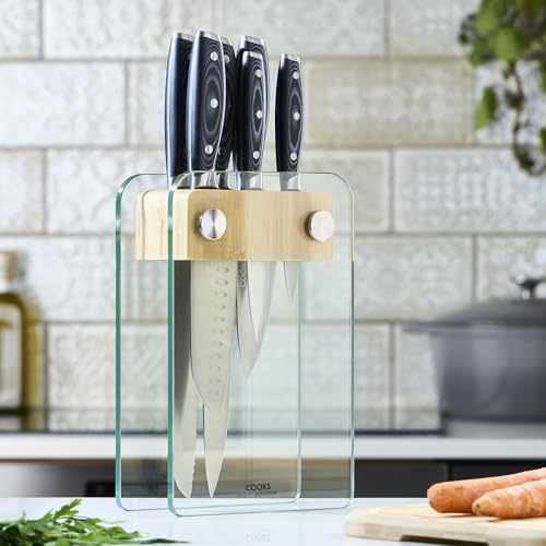 - Tempered Glass and Bamboo Knife Block: This set includes a stylish, modern bamboo and tempered glass knife block that not only keeps your knives organised but also adds a contemporary touch to your kitchen. The transparent design lets you easily see and access each knife, while the sturdy construction keeps the blades securely in place.