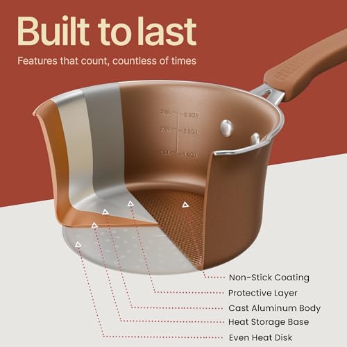 - UTENSILS INCLUDED – we want you to have everything you need when roasting, baking and preparing delicious meals and snacks which is why we have also included heat-resistant kitchen tool utensils with our pan set. The soup ladle, spatula, brush and measuring spoons are made from engineered silicone and all match the design of the pots and pans so you can enjoy modern cookware in your kitchen