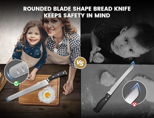 - Experience safety like never before with our humanized bread slicing knife. The rounded blade shape, full-tang construction, and anti-fatigue curvature work together seamlessly to ensure your safety, even in the busiest kitchens. Use with confidence and enjoy peace of mind. Whether for personal use or as a thoughtful gift, it's the perfect choice