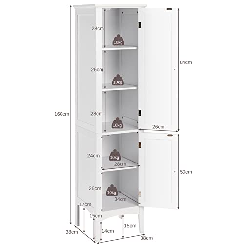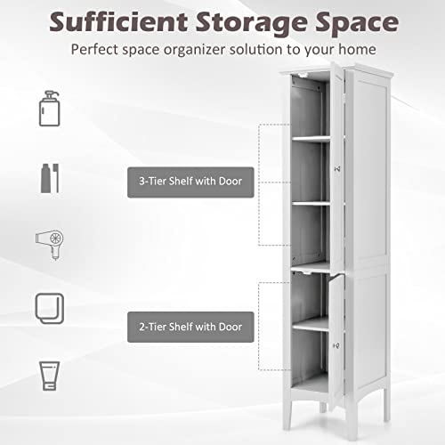 COSTWAY Bathroom Tall Cabinet, Freestanding Storage Cupboard with 2 Doors and 5-Tier Shelves, Wooden Slim High Floor Cabinet for Living Room Kitchen Hallway (White)