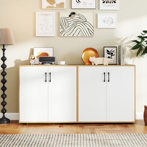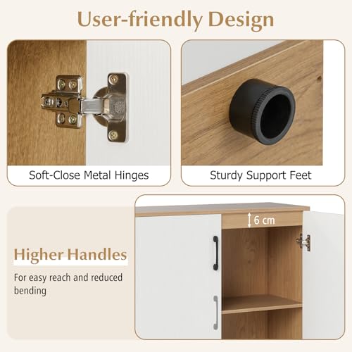 - 【Ease of Use at Your Fingertips】 Designed with your comfort in mind, the higher handle position allows for easy reach and reduced bending. And with soft-close metal hinges, the sideboard’s doors close quietly and smoothly.