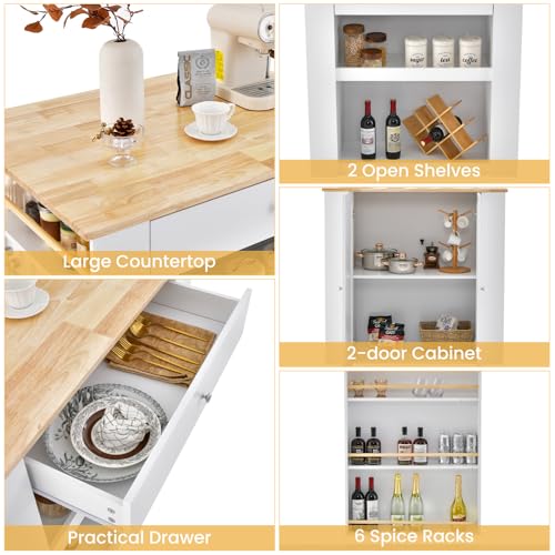 COSTWAY Kitchen Island Cabinet, Buffet Storage Sideboard with Rubber Wood Countertop, 2-Door Cabinet, Drawer, 2 Open Shelves and 6 Spice Racks, Serving Utility Cabinet Organizer for Home Dining Room