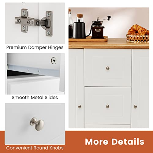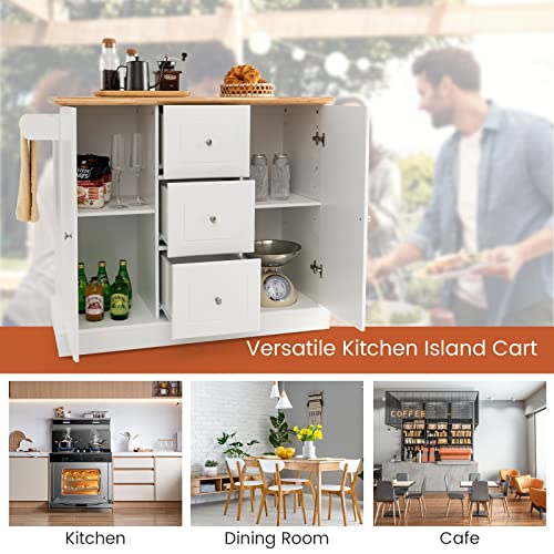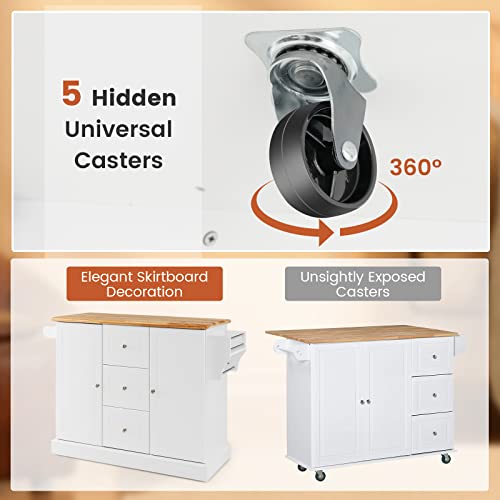 COSTWAY Large Kitchen Island on Hidden Wheels, Rolling Storage Trolley Cart with Rubber Wood Countertop, 3 Drawers, 2 Cabinets & Adjustable Shelf, Serving Utility Organiser Cabinet,127x46x92cm (White)