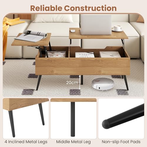 COSTWAY Lift Up Top Coffee Table, Wooden Double Lifting Cocktail Center Table with Hidden Storage Compartments, 5 Metal Legs Rectangle Accent Sofa Side Tea Tables for Living Room Office (Natural)